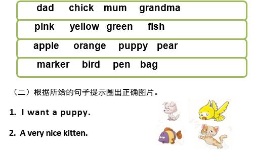 (二)句子:①I want a puppy. 我想要一只小狗。(puppy可换成其他动物)